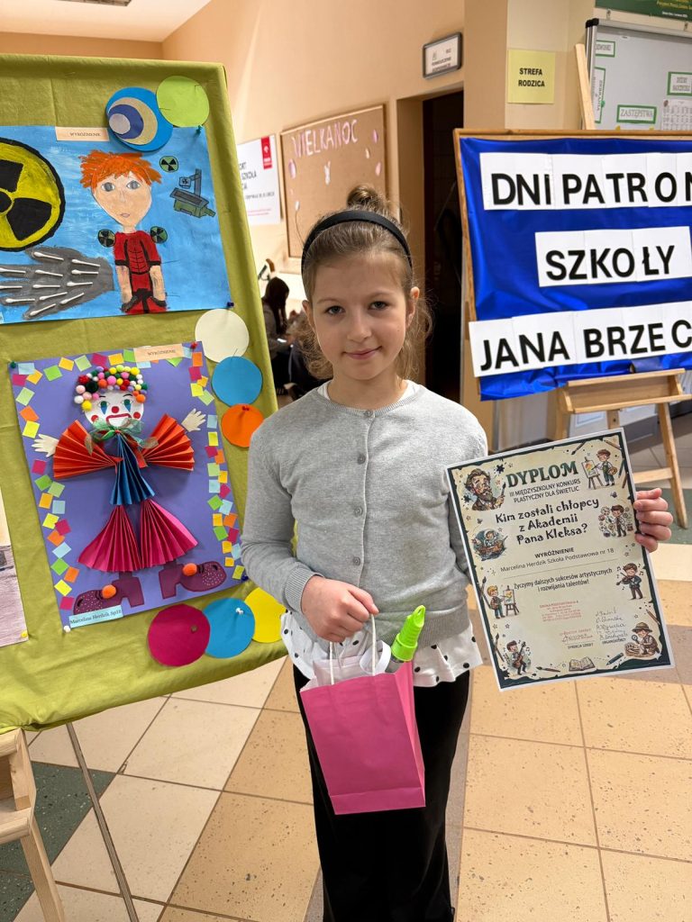 Dnia 18 marca odbyło się rozstrzygnięcie międzyszkolnego konkursu plastycznego pt.”Kim zostali chłopcy z Akademii Pana Kleksa?” w świetlicy szkolnej Szkoły Podstawowej nr 8. Miło nam poinformować, że uczennica Marcelina Herdzik otrzymała wyróżnienie za pracę którą wykonała pod opieką pani Jolanty Popiel .Marcelina miała dużą konkurencję ,ponieważ wpłynęło bardzo dużo prac z zielongórskich szkół. Prace były ładne i ciekawe, tym bardziej musimy być dumni z Marceliny. Serdecznie gratulujemy nagrody i pięknego reprezentowania naszej świetlicy.